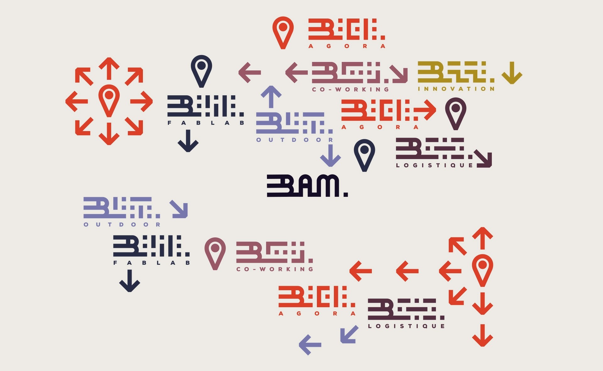 Chaque secteur d’activité de BAM possède sa propre déclinaison chromatique, permettant une navigation fluide entre leurs différents services (conseil, expérimentation, événements).
