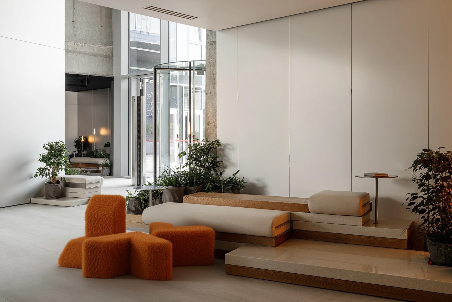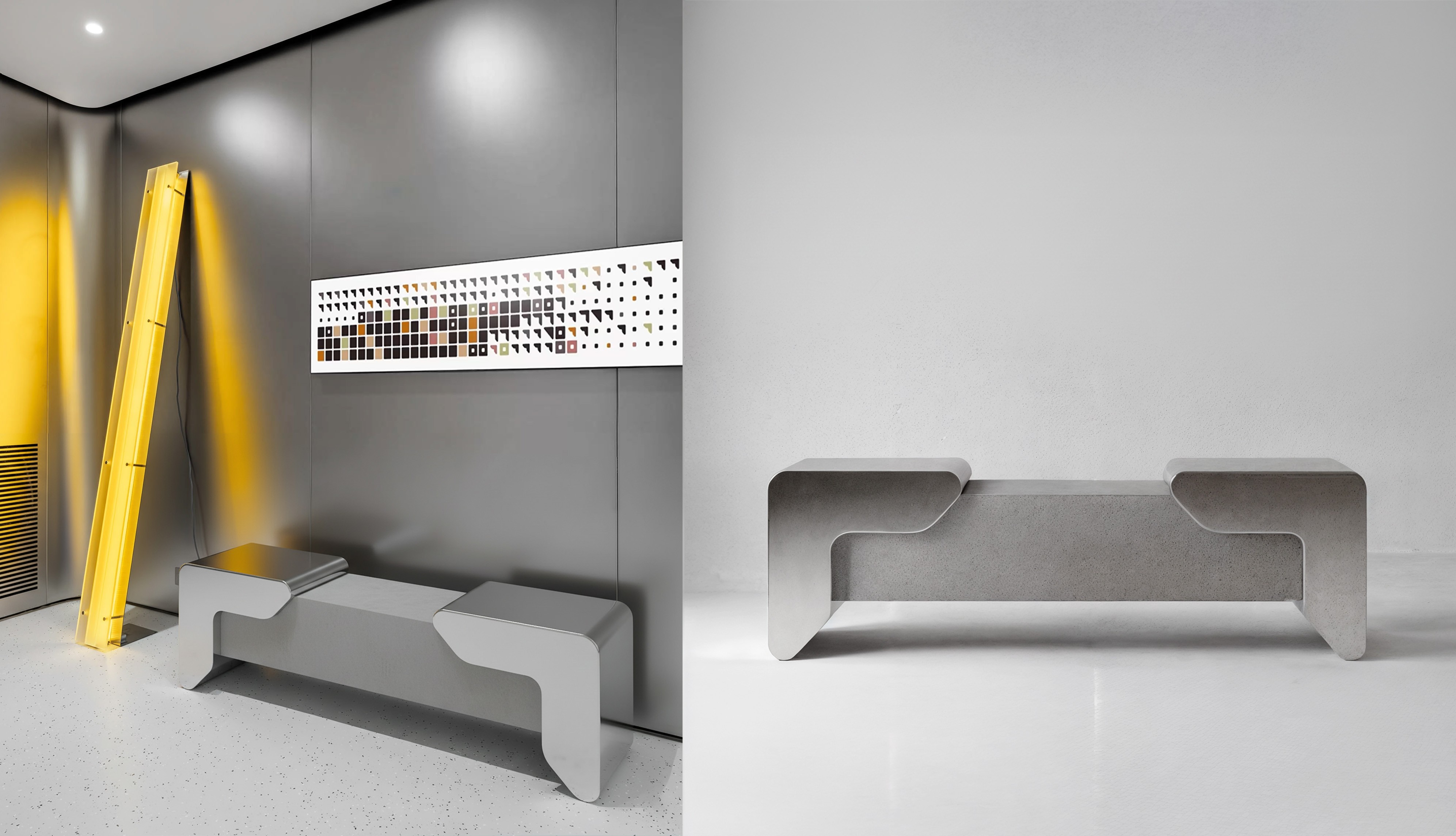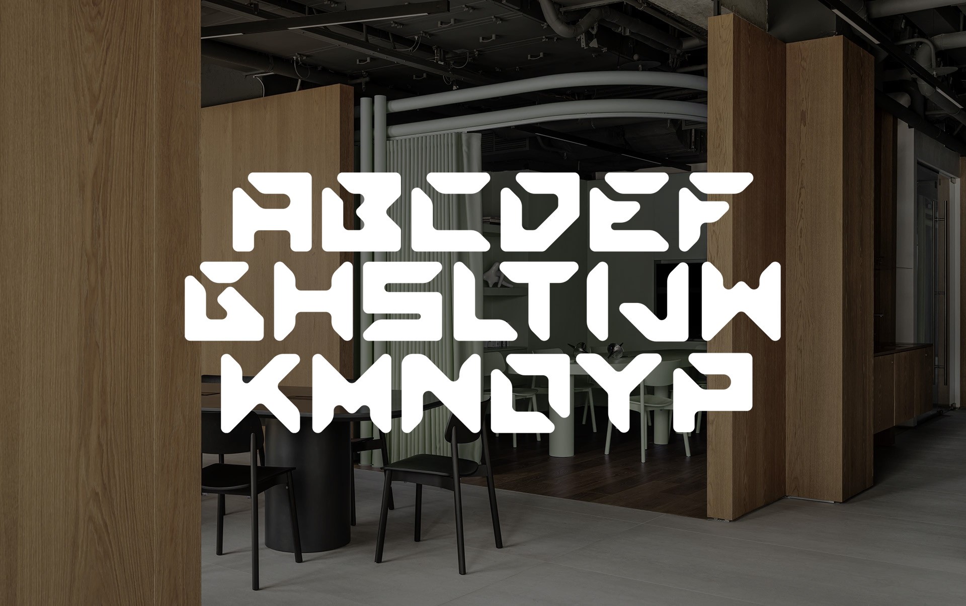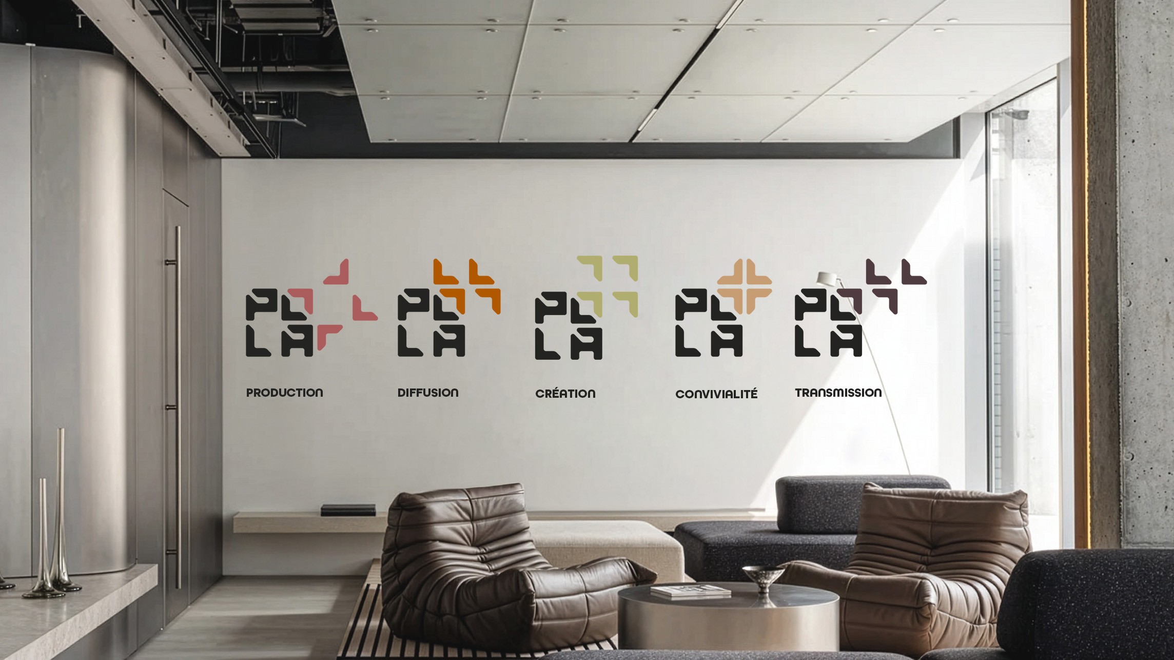 Le logo est un élément structurel qui se décline à l'infini, un outil de conception pour la signalétique et le mobilier sur-mesure du bâtiment, créant une symbiose totale entre l'image et l'espace.