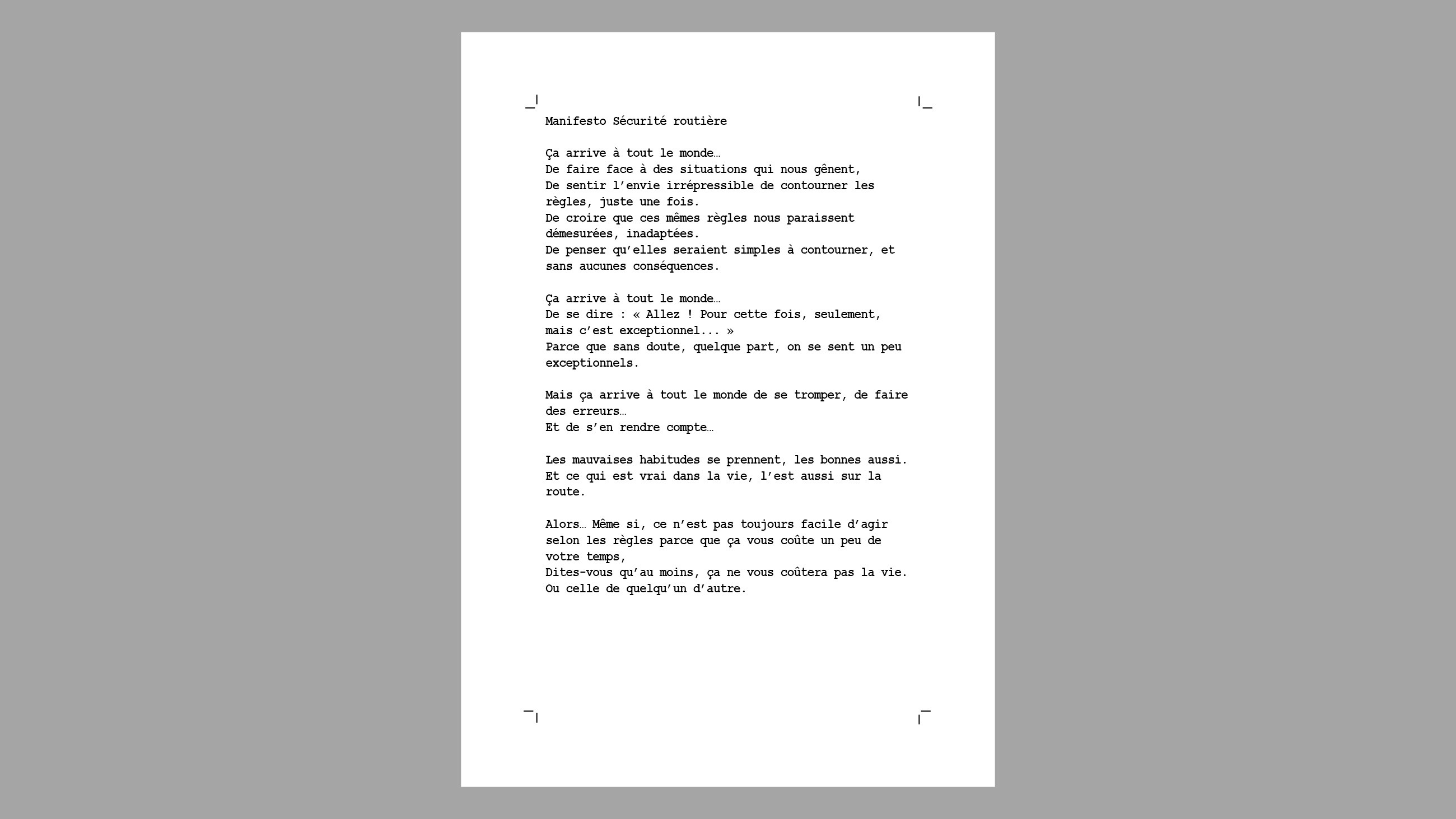 à travers un manifesto, la Sécurite Routière fait le pari d’une démarche plus inclusive, revenant aux fondements de notre savoir-être et mettant en avant une conduite solidaire, humaine, qui se réaliserait tout autant au volant de nos véhicules que dans notre vie de tous les jours.